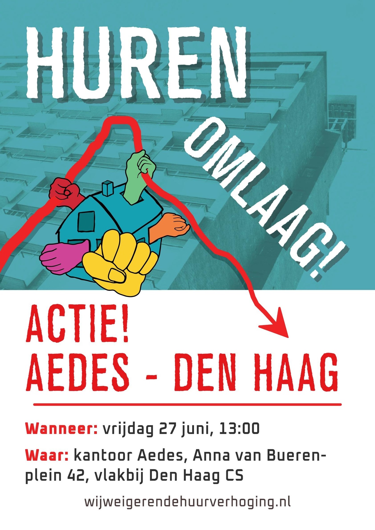 Op 27 juni om 13:00 verzamelen wij ons bij het kantoor van Aedes in Den Haag op Anna van Buerenplein 42 (vlak naast Den Haag Centraal). Wij komen met onze eisen én met een zwartboek: met verhalen van huurders over de impact van torenhoge huren. Wij leggen ons niet neer bij hun beleid van afbraak. Wij eisen: