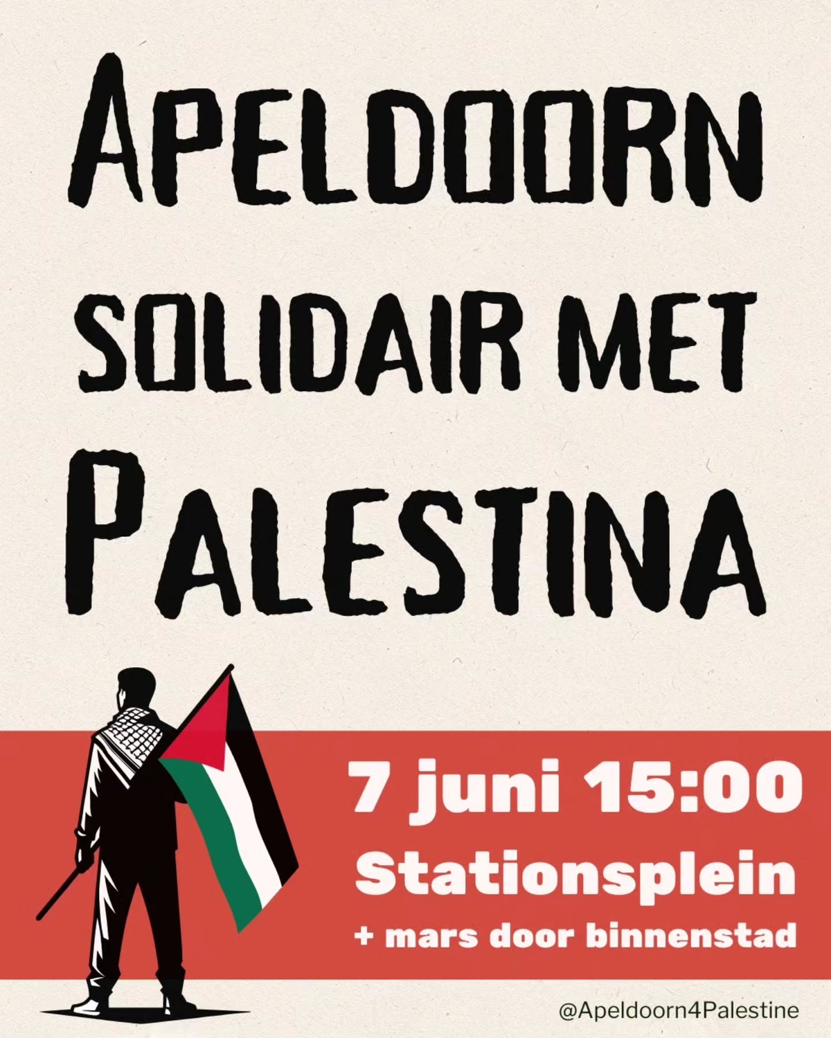 Op zaterdag 7 juni gaat Apeldoorn weer de straat op om solidariteit te tonen met Palestina! Om 15:00 uur zal de demonstratie starten met een aantal toespraken op het Stationsplein. Vanaf ongeveer 15:30 is er een mars door de binnenstad, waarna we weer eindigen bij het station. Wees erbij en verspreid het woord! 🇵🇸✊