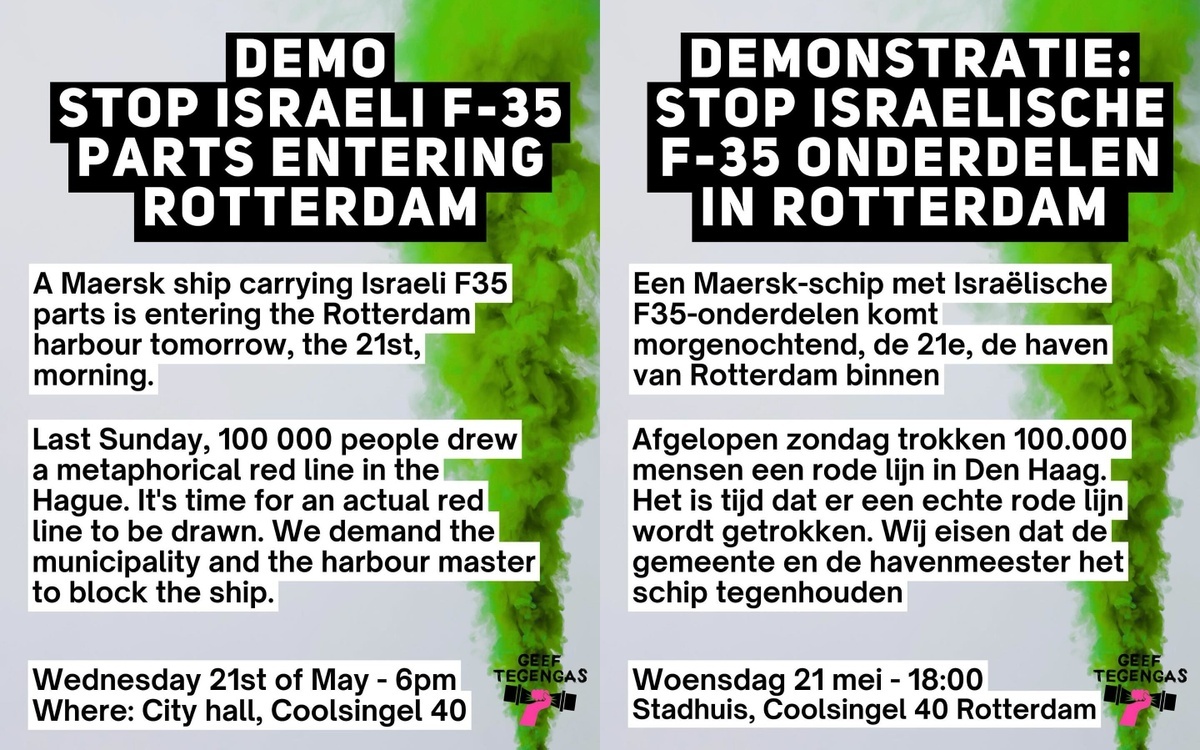 A Maersk ship carrying Israeli F35 parts is about to enter the Rotterdam harbour tomorrow morning (21st of May).
