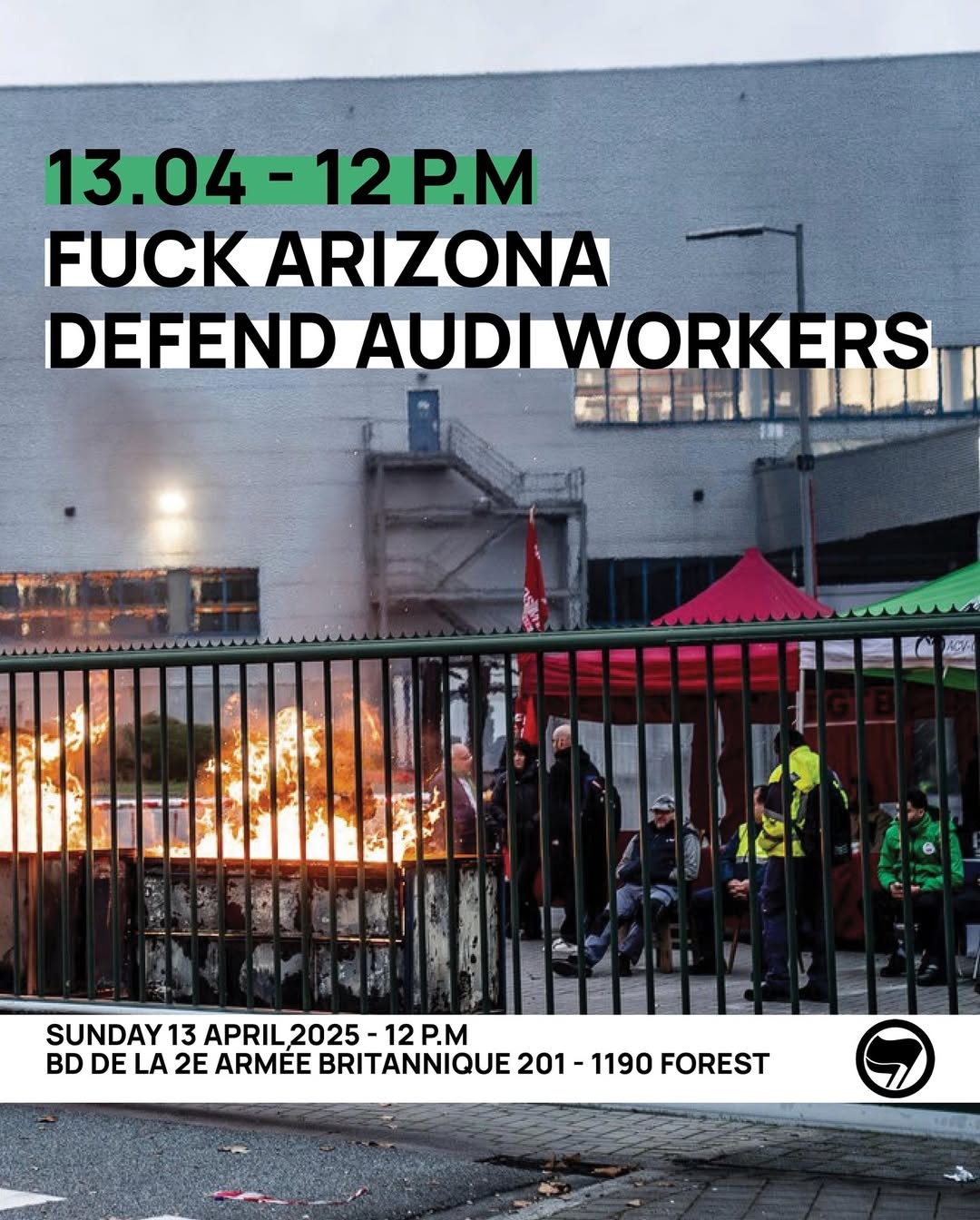 This Sunday, April 13, at noon, for Act III against Arizona, a rally has been organized by the Brussels antifascist AG in front of the factory. To support them directly. To rebuild their camp, destroyed by the police. And to warn that the closure of the Audi plant is not just a social disaster, but also a gateway to a militarized future.