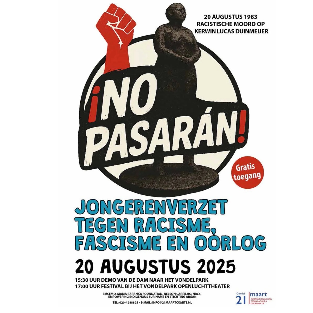 Wij, het Comite 21 maart, Empowering-Indigenous-Su, de Nationale reparatie commissie Suriname, stichting Argan Mama Baranka Foundation de Vrienden van Kerwin en vele meer roepen alle jongeren, activisten, jongerenorganisaties en maatschappelijke organisaties op om in verzet te gaan tegen racisme, fascisme en oorlog.