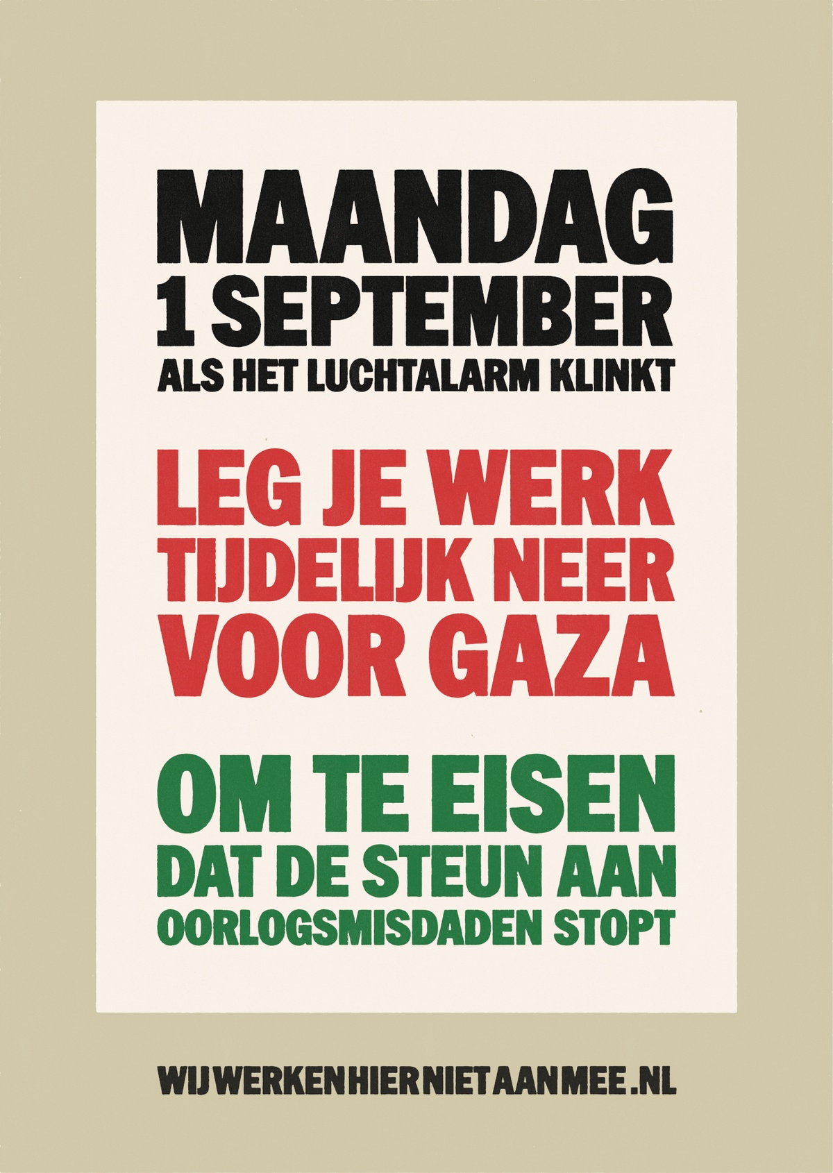 Wil jij ook dat onze regering serieus in actie komt om de genocide in Gaza tegen te gaan? Roep dan samen met ons iedereen op om op 1 september, in het rood gekleed, duidelijk te laten horen dat business-as-usual geen optie is: Wij werken hier niet aan mee.