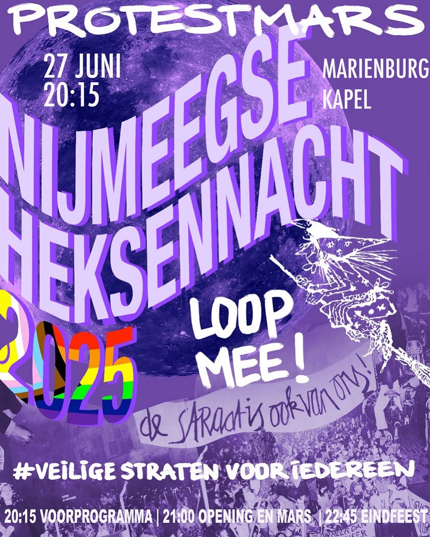 2025, the streets are still not safe. There are still too many stories, too many texts saying “Did you get home safe?”, too many unpleasant experiences. Let’s take to the streets together and show that it can be different. Dance, chalk, and shout with us on June 27 during this third edition of the Nijmeegse Heksennacht.