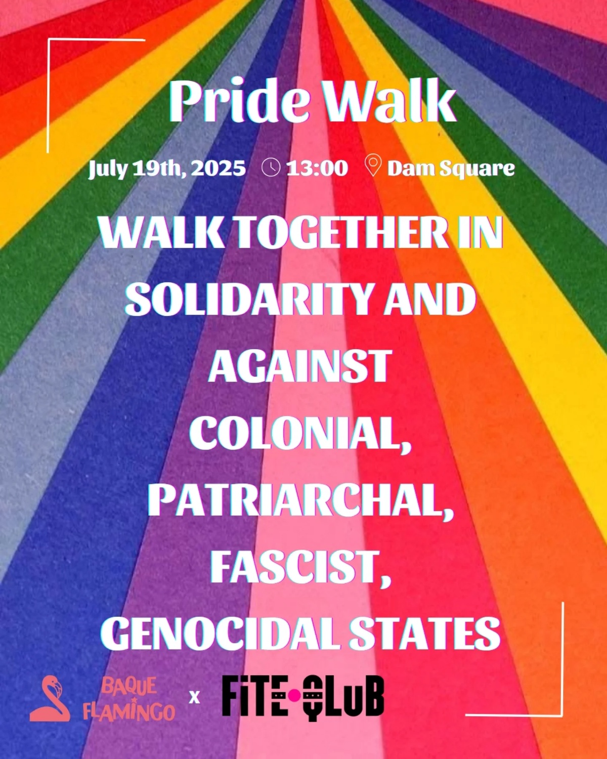 Pride is a protest! On Saturday 19 July we will march with many Queer & Trans collectives during the Pride Walk in Amsterdam. We want to form a radical decolonial block that speaks up about the injustice that is happening in Palestine, Sudan, Congo and many other Global Southern countries in the world.