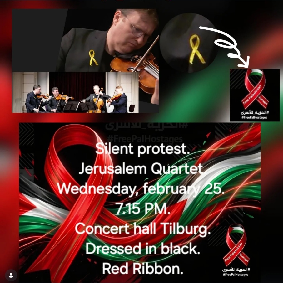 Op 25 februari treedt het Jerusalem Quartet op in Tilburg. Dit orkest is onderdeel van de 'Brand Israël Campagne'. Dat is in het leven geroepen door het Israëlische ministerie van Buitenlandse Zaken om het imago van Israël op te poetsen en oorlogsmisdaden te verdoezelen. Het Jerusalem Quartet heeft aangegeven trots te zijn op de status 'culturele ambassadeur van Israël' en 'distinguished IDF musicians'.