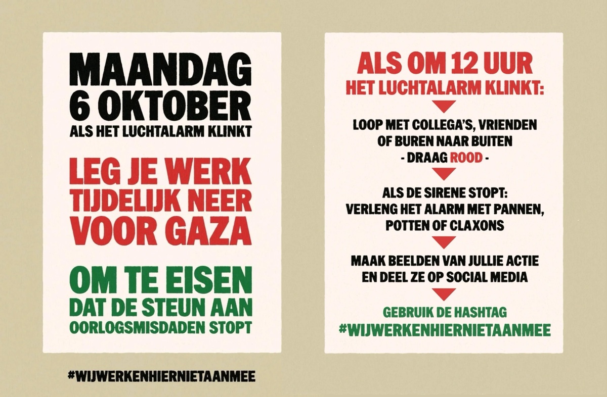 Op maandag 6 oktober laten we opnieuw in heel Nederland luidkeels horen dat wij niet meewerken aan het kabinetsbeleid ten aanzien van Gaza, nu met nog meer mensen. Elke eerste maandag van de maand blijven we het werk neerleggen, tot er sancties tegen Israël volgen.