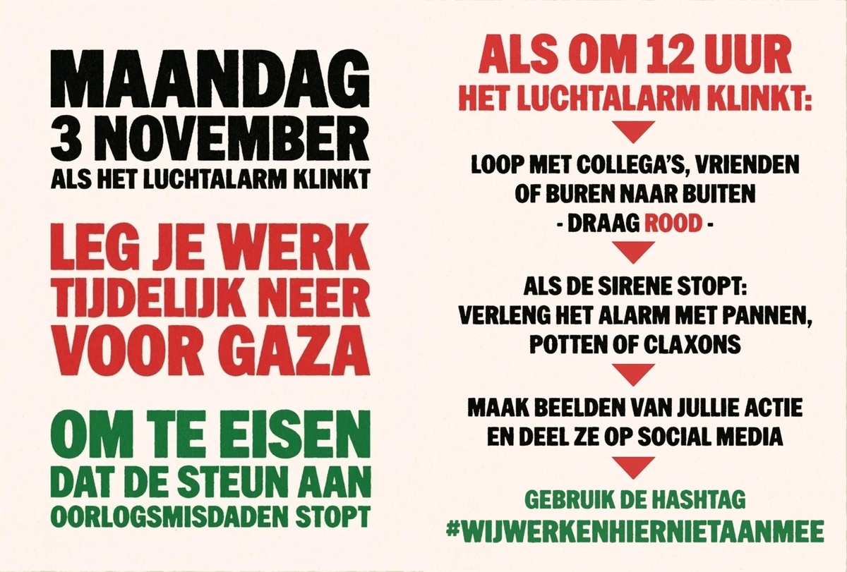 Al twee maandagen legden we met velen onze werkzaamheden kortdurend neer om duidelijk te maken dat wij niet achter het kabinetsbeleid ten aanzien van Gaza staan. Op maandag 3 november laten we opnieuw in heel Nederland luidkeels horen dat wij niet meewerken, nu met nog meer mensen. Elke eerste maandag van de maand blijven we het werk neerleggen, tot er sancties tegen Israël volgen.